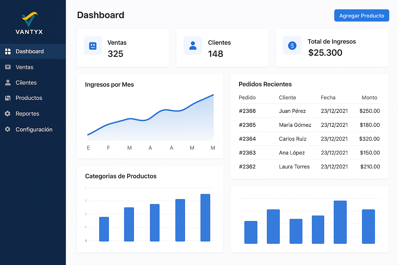 Vantyx es un software de gestión (ERP/CRM) para PyMEs argentinas. Integra facturación electrónica ARCA, inventario, punto de venta (POS) y CRM en un solo sistema, con control de ventas y stock en tiempo real. Adaptado a la normativa fiscal local y al trabajo diario de los sectores de comercio, gastronomía y servicios.